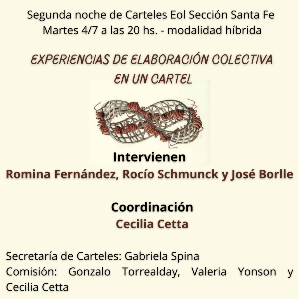 1 min to read Noche de carteles Posted on 4 julio, 20238 julio, 2023 Segunda noche de Carteles EOL Sección Santa Fe: Experiencias de elaboración colectiva en un cartel RESENA-2DA-NOCHE-CARTELES-STA-FE-2023-1Descarga